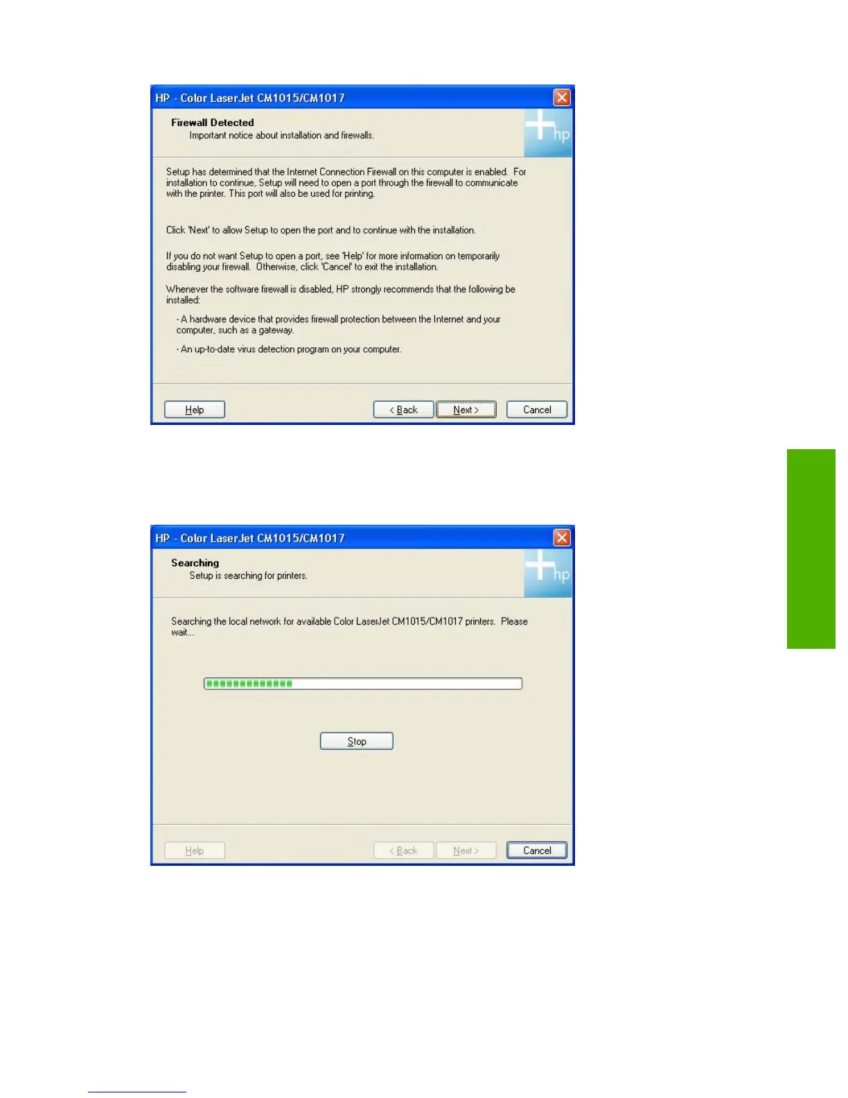 Click Next to continue the installation. The installer searches the network for the HP Color