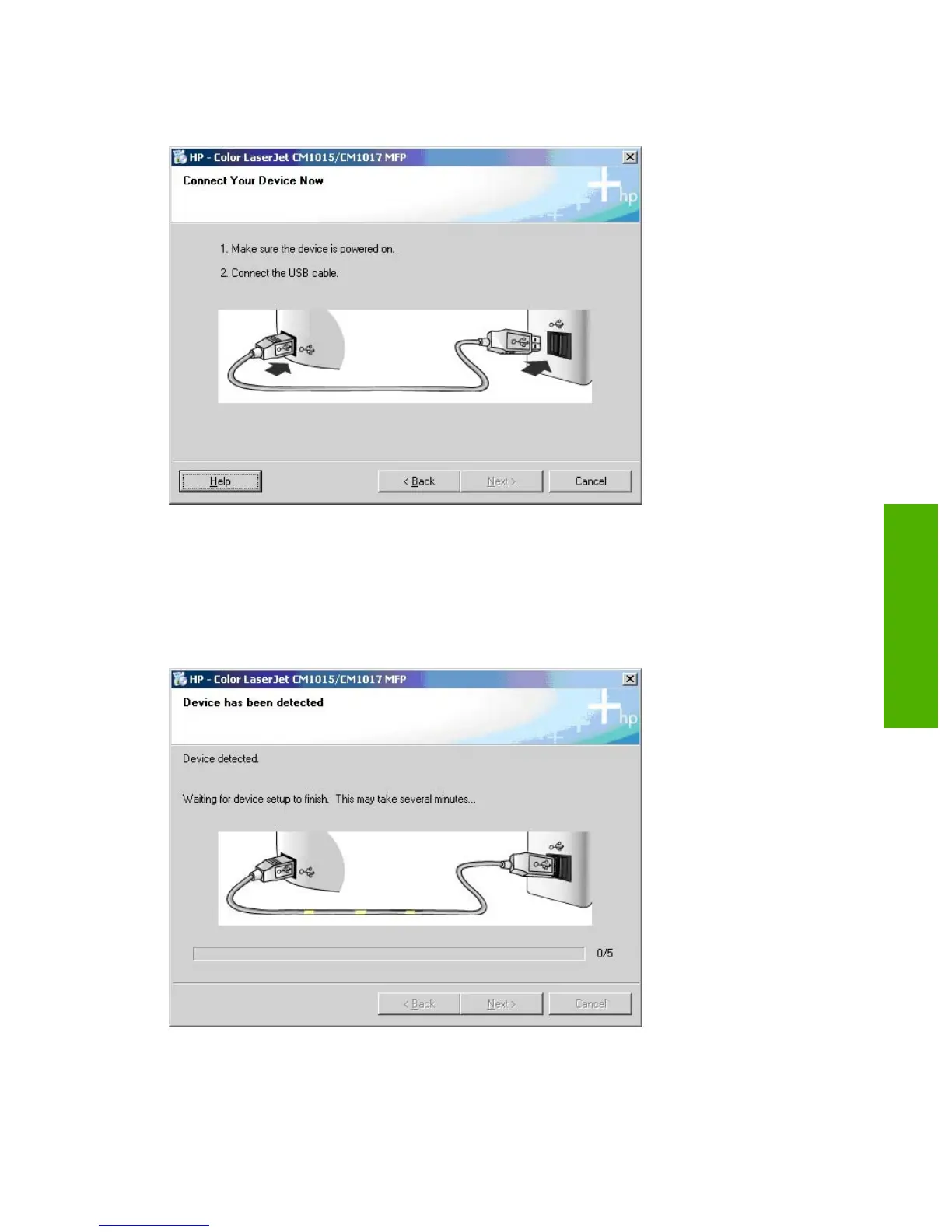 LaserJet CM1015 MFP/CM1017 MFP is turned on. Then attach the USB cable to the computer and to