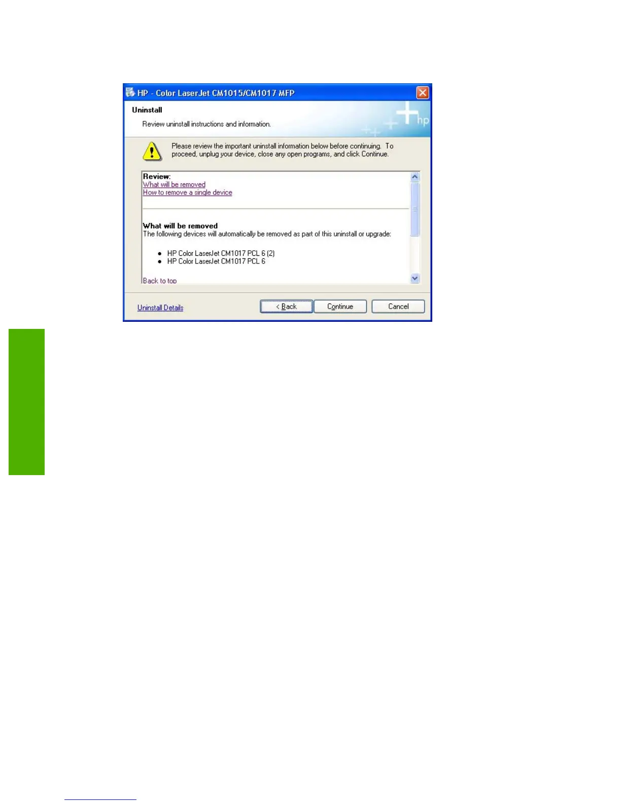 Clicking What will be removed shows the list of MFPs to be uninstalled.