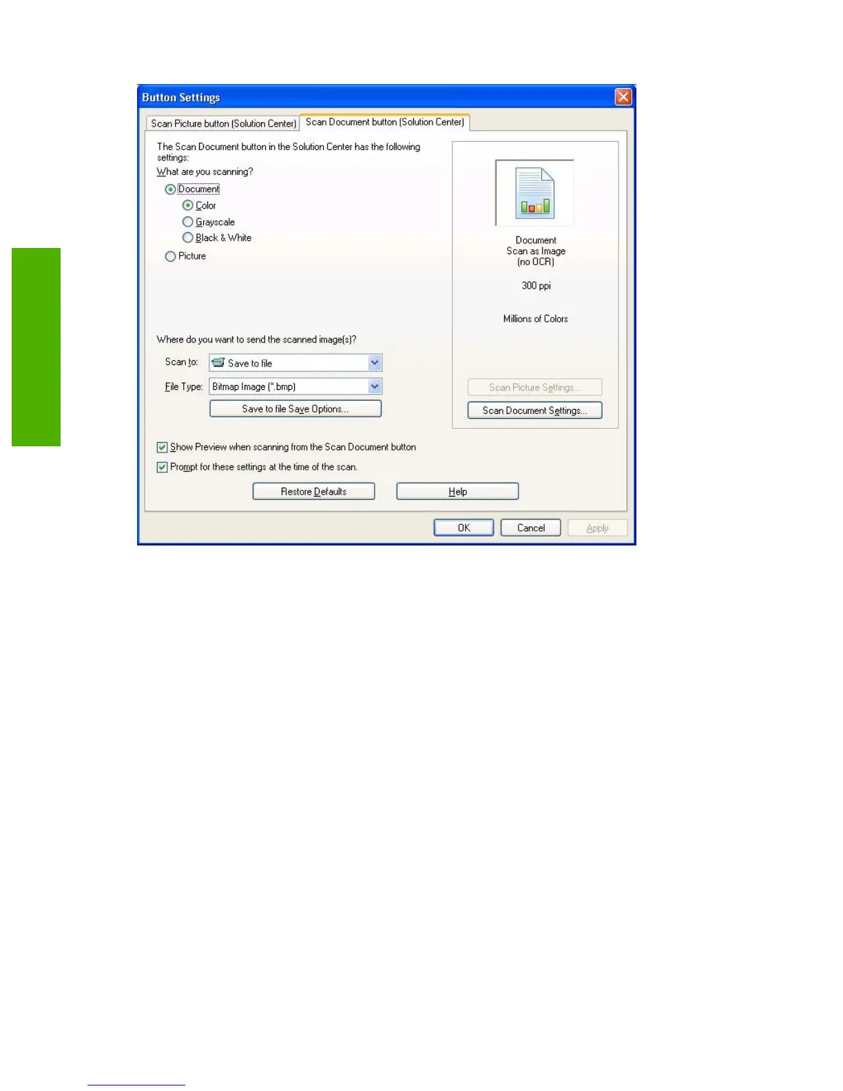 Figure 2-12 Scan Document button tab – Button Settings dialog box – HP Solution Center