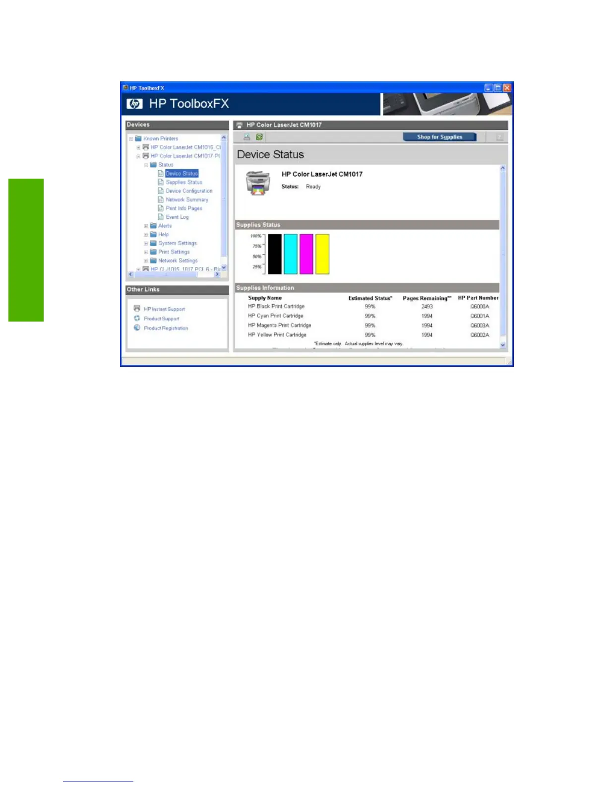 Printer Toolbox. Clicking Printer Toolbox. opens the following screen in the HP ToolboxFX.