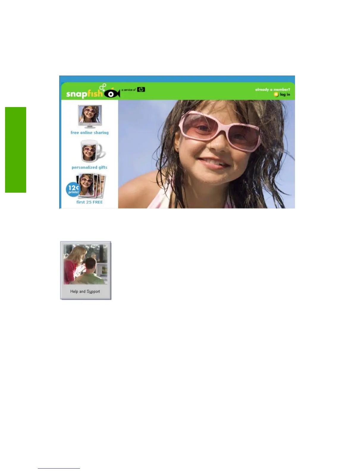opens the Web browser to the Snapfish.com Web site, a service of HP, where sharing photos, ordering