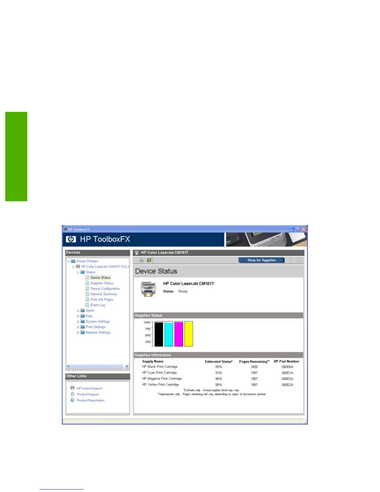 HP ToolboxFX window. The Other Links pane contains links to the HP Instant Support, Product