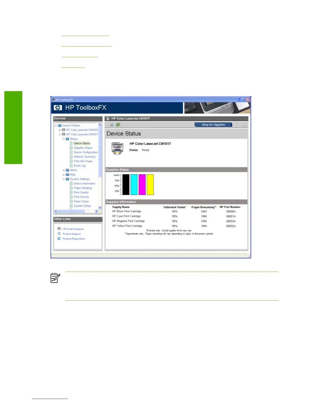 NOTE The HP Color LaserJet CM1015 MFP/CM1017 MFP include a Supplies Status section