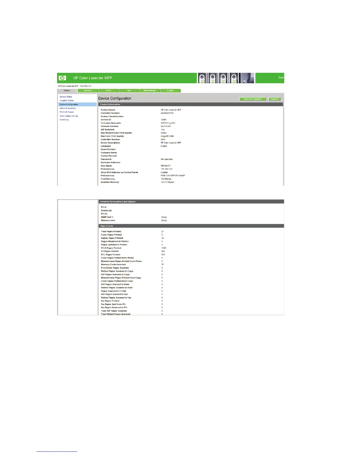 Figure 2-78 HP EWS Status tab – Device Configuration page (2 of 6)