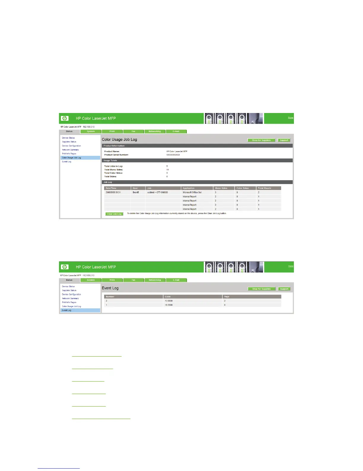 Figure 2-87 HP EWS Status tab – Color Usage Job Log page