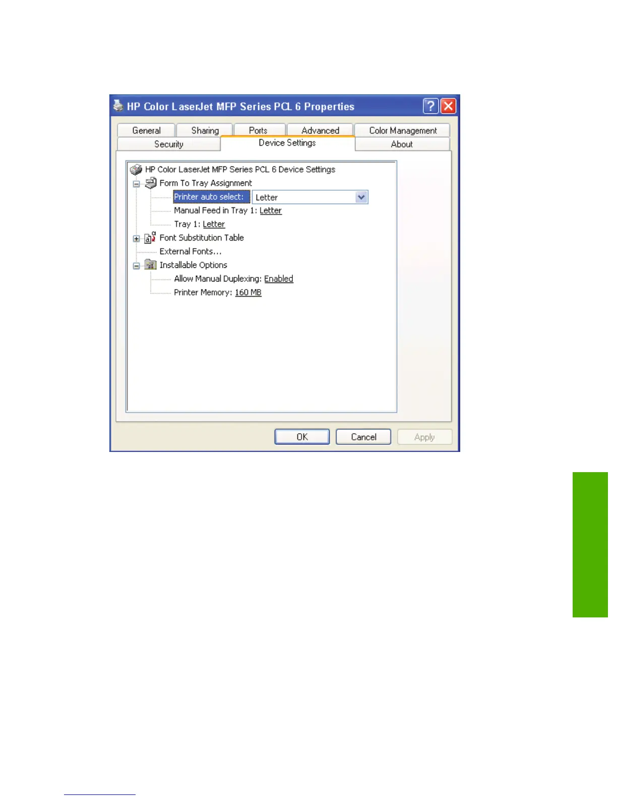 The following figure shows the Device Settings tab for the HP PCL 6.