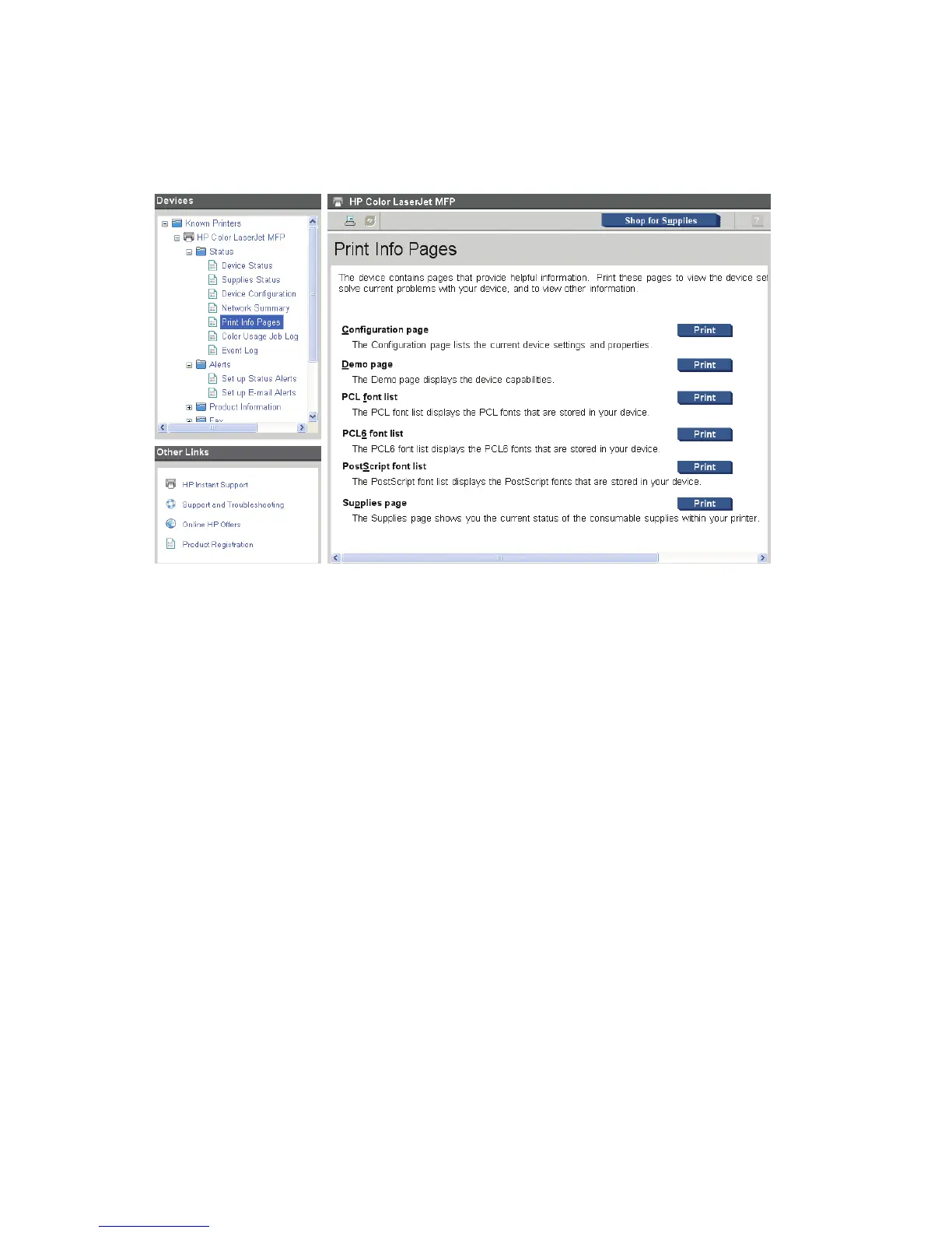 Figure 2-16 HP ToolboxFX Status folder – Print Info Pages pane