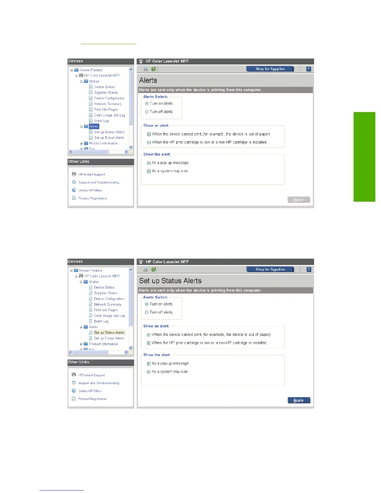 Figure 2-20 HP ToolboxFX Alerts folder – Set up Status Alerts pane
