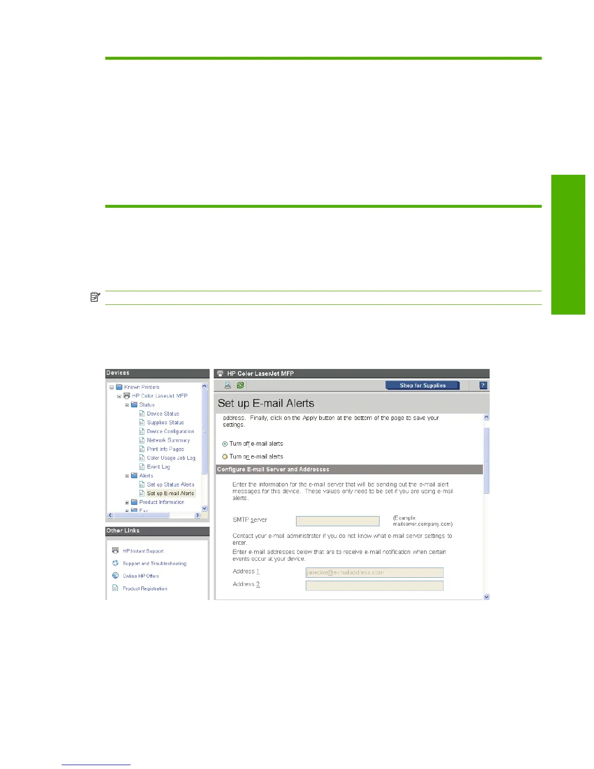 Figure 2-21 HP ToolboxFX Alerts folder – Set up E-mail Alerts pane (1 of 3)