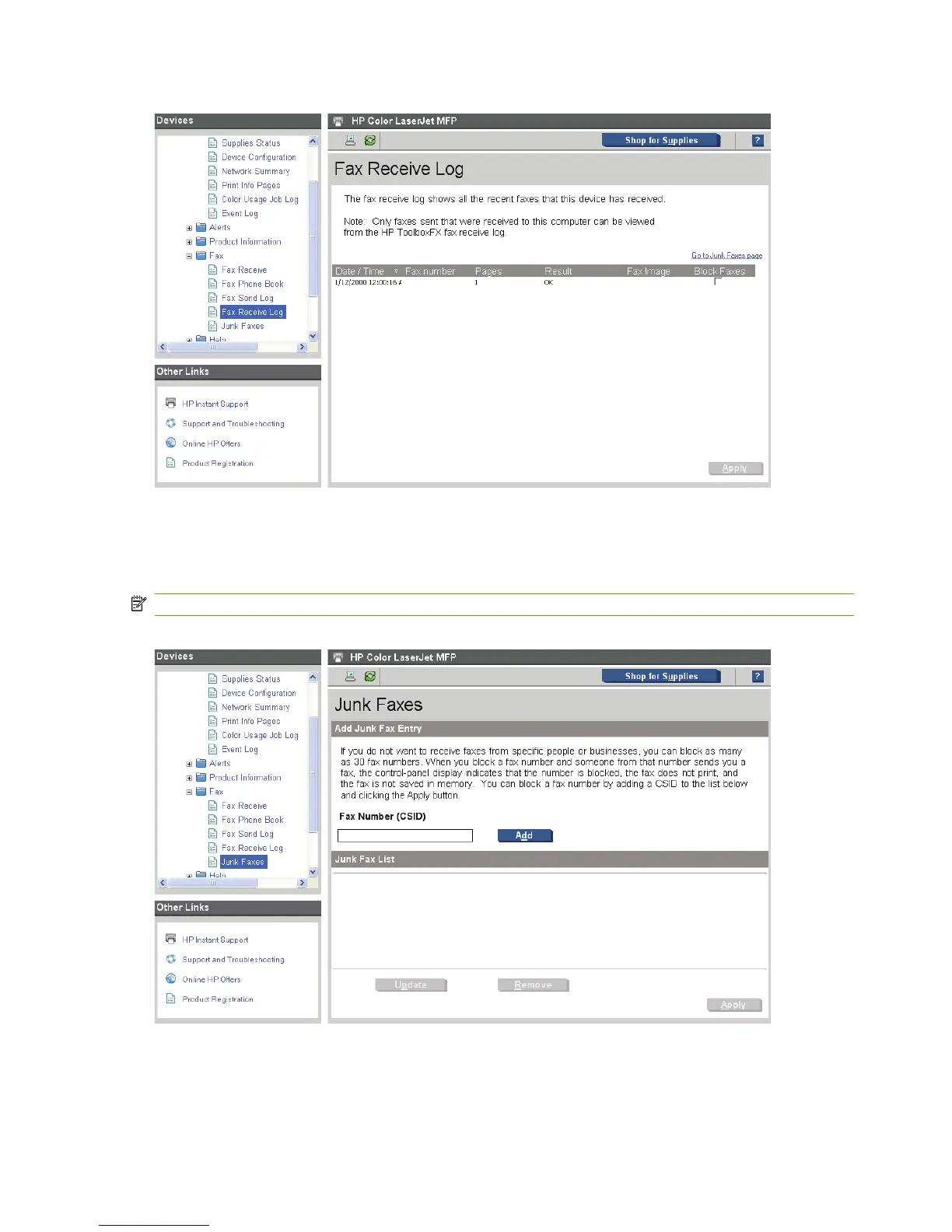 Figure 2-31 HP Toolbox FX Fax folder – Junk Faxes pane