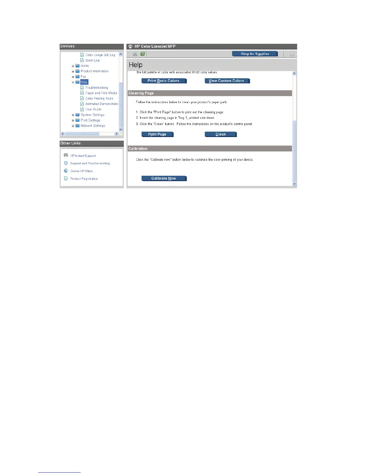 Troubleshooting. Click this button to open the Troubleshooting chapter of the HP Color LaserJet