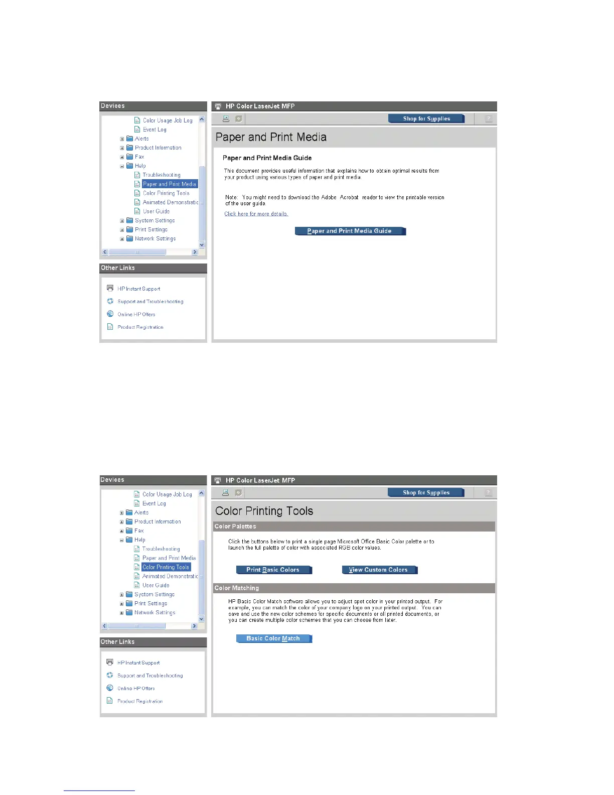 Figure 2-37 HP ToolboxFX Help folder Color Printing Tools pane