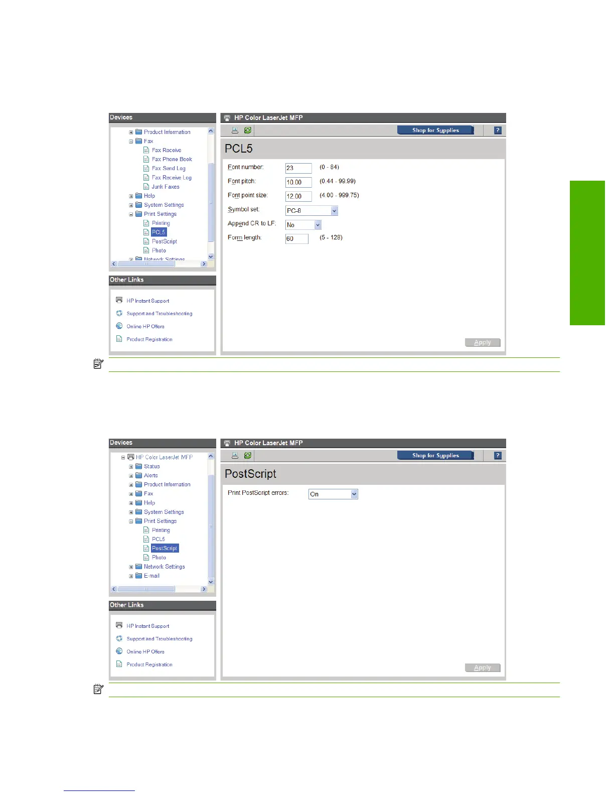 Figure 2-58 HP Toolbox FX Print Settings folder – PCL5 pane
