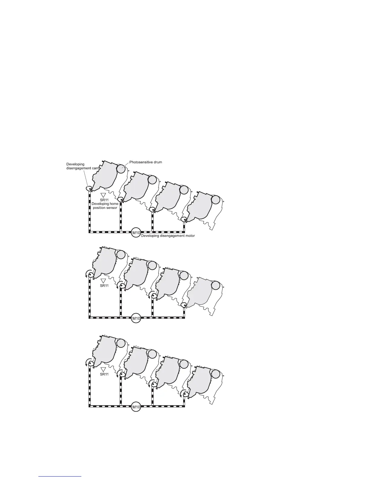 The DC controller rotates the developing disengagement motor and changes the direction of the cam