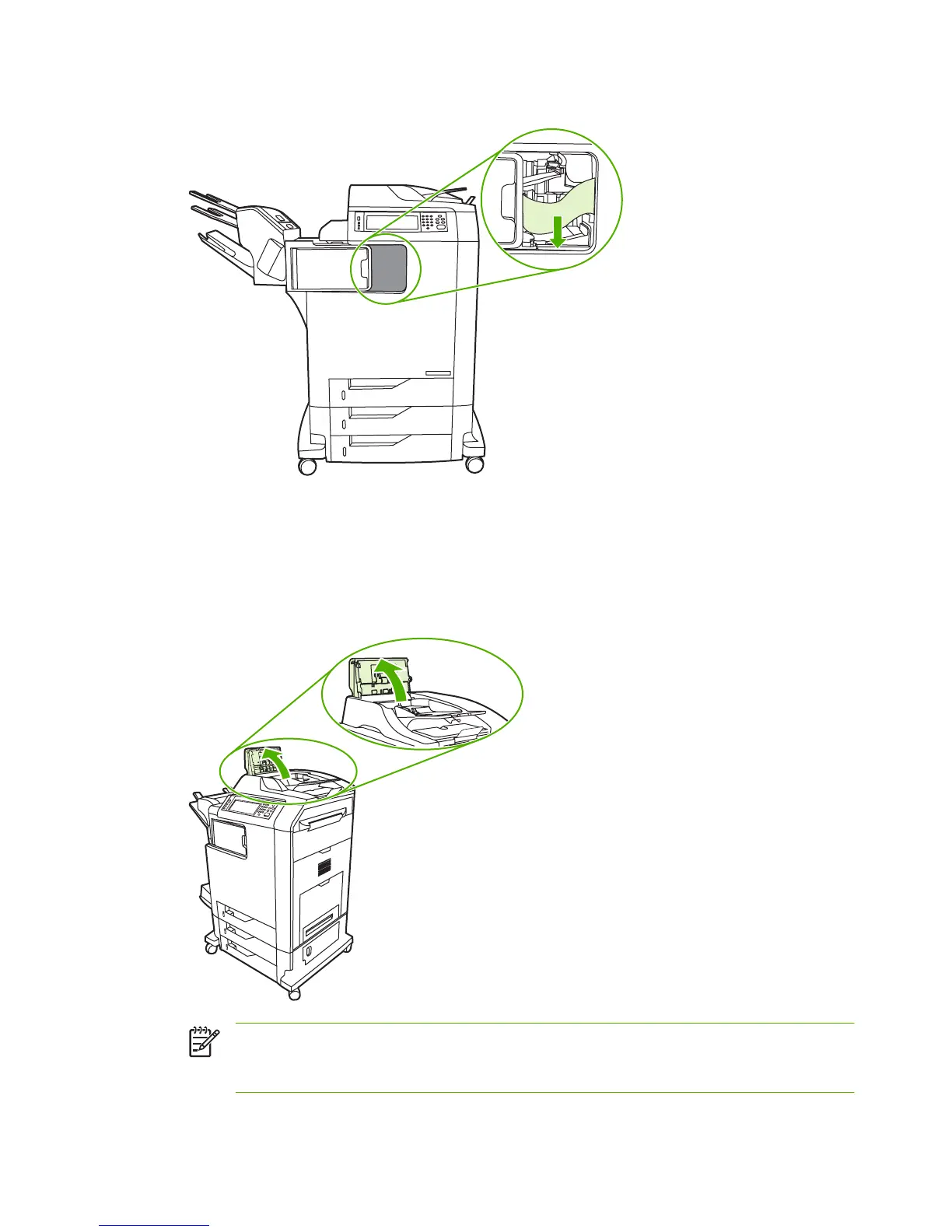 7. Slide the 3-bin mailbox or stapler/stacker back into the MFP.