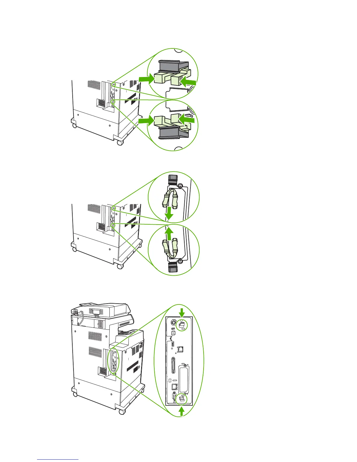 3. Locate the gray formatter pressure release tabs on the formatter board in the rear of the MFP.