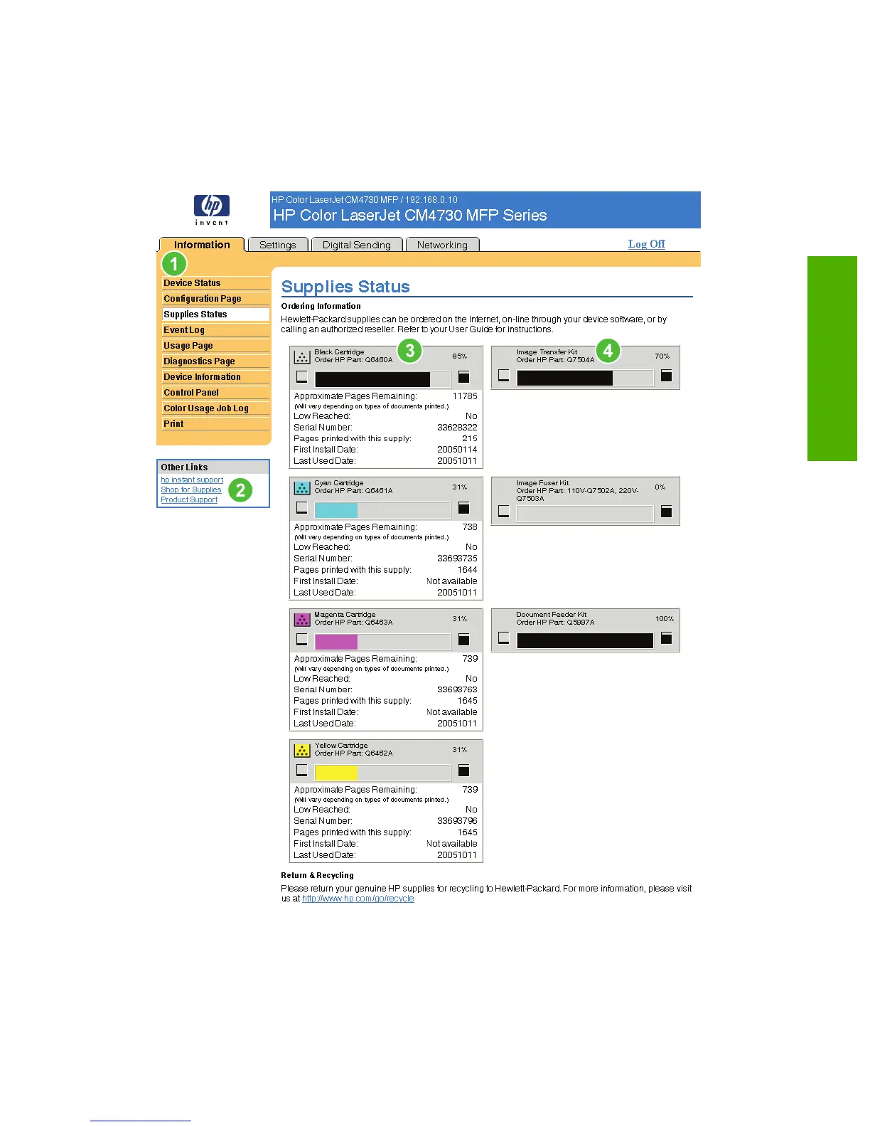 The Supplies Status screen shows more detailed supplies information and provides part numbers for