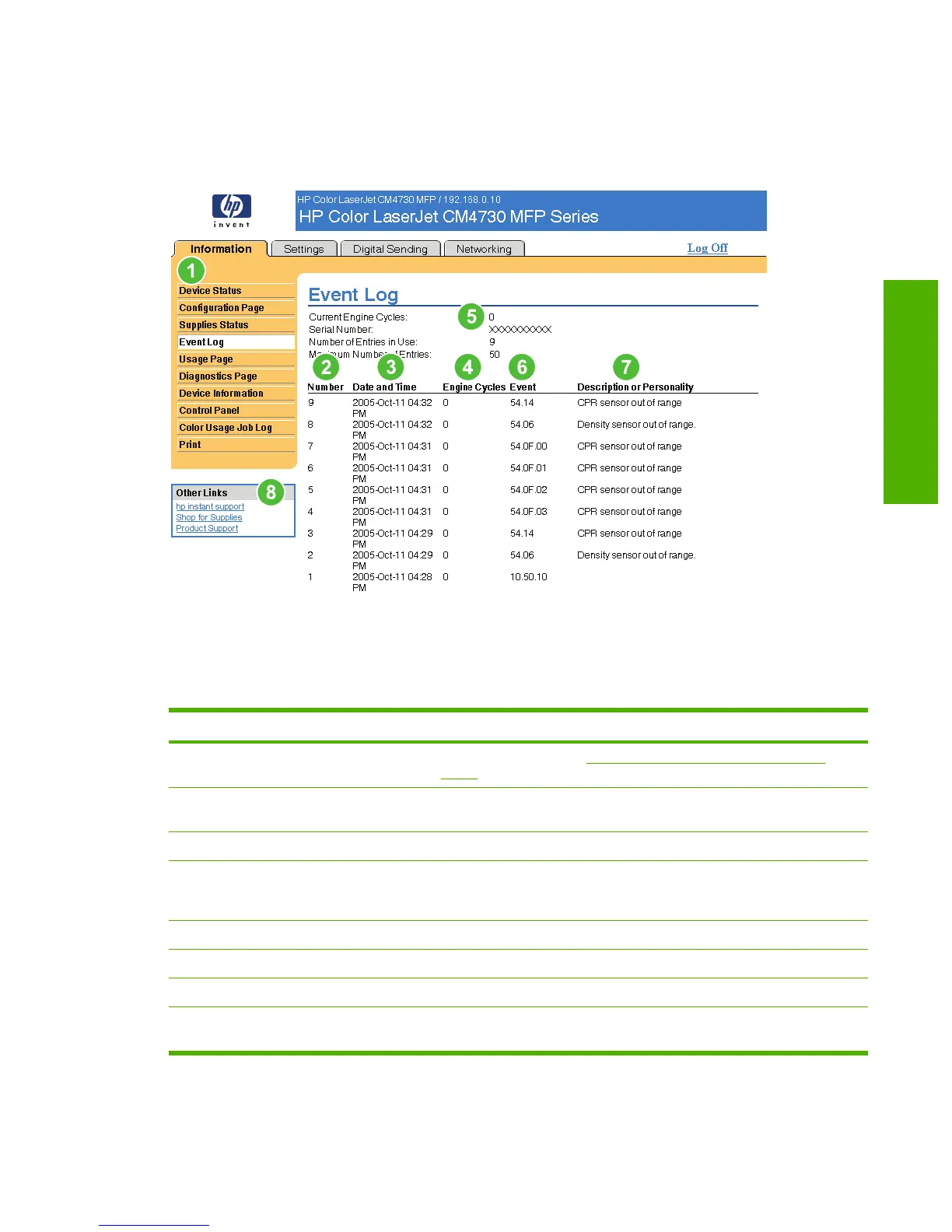 The Event Log screen shows the most recent product events, including jams, service errors, and other