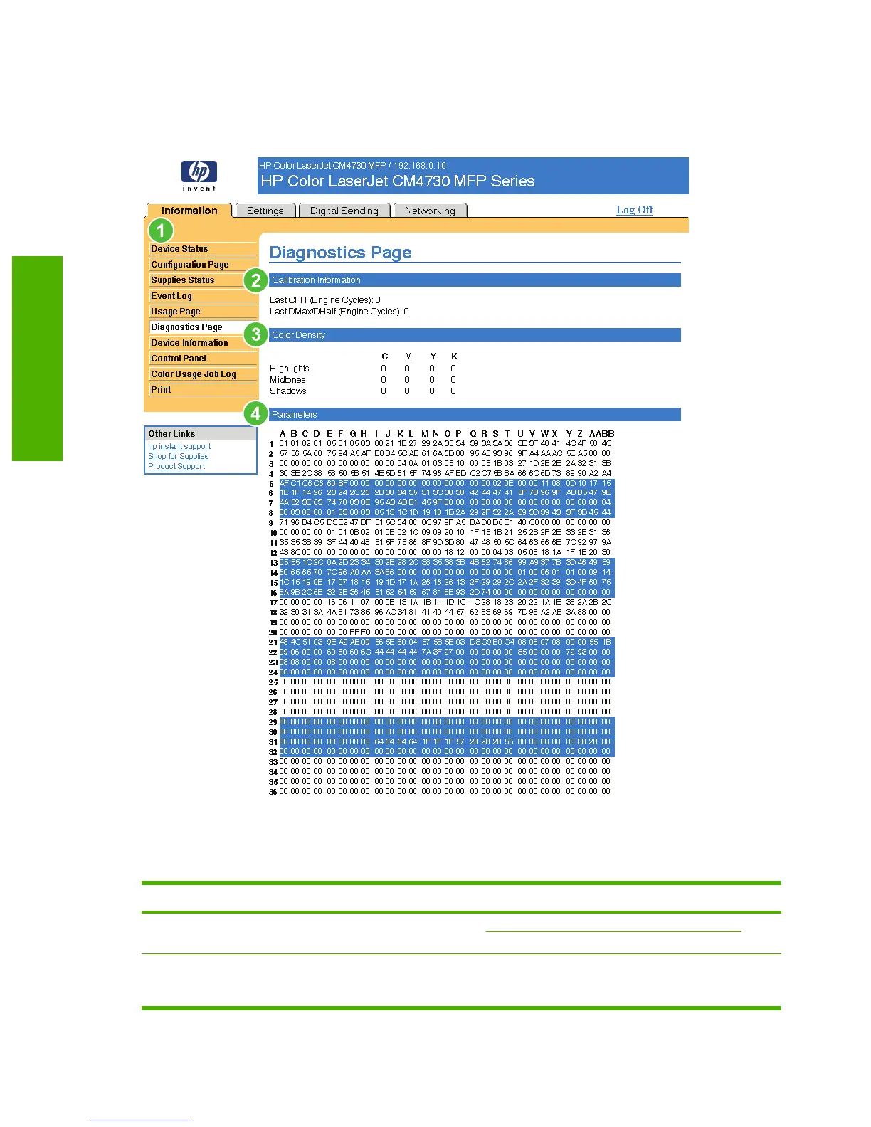 The Diagnostics Page screen provides information about calibration, color density, and parameters.