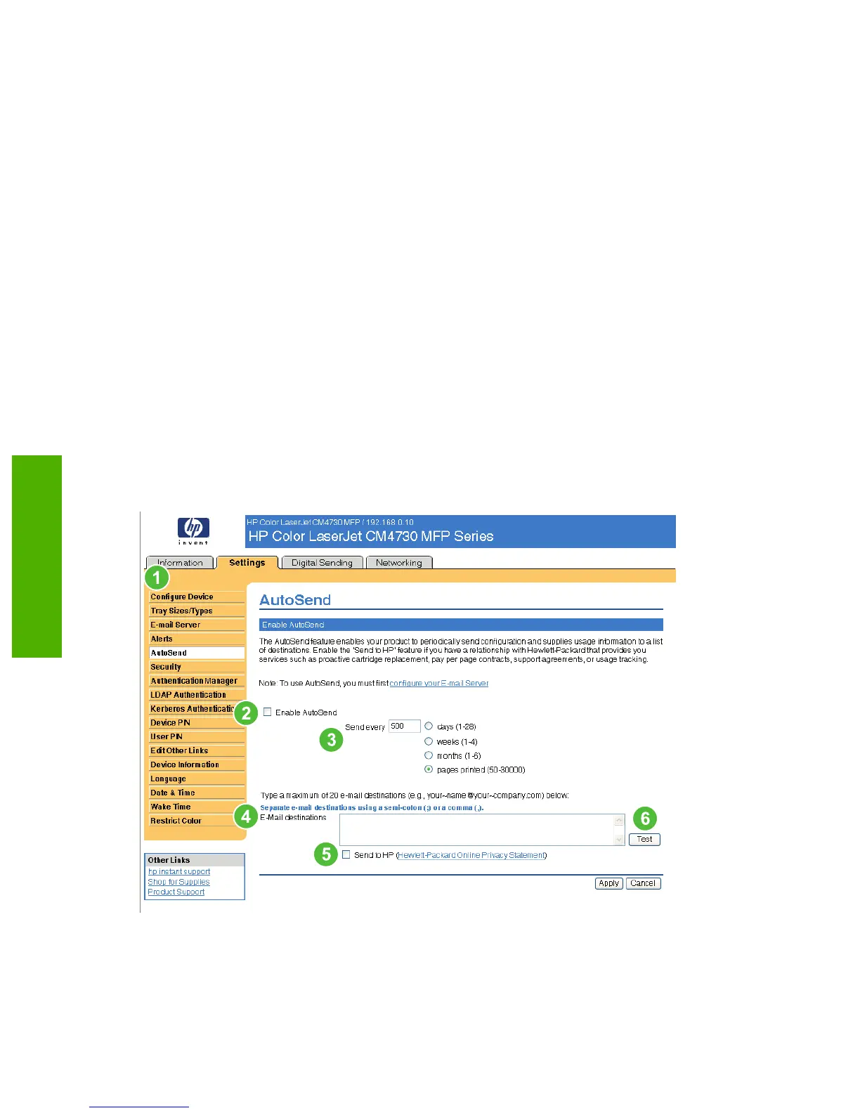 Use the AutoSend screen to send product-configuration and supplies-usage information periodically to