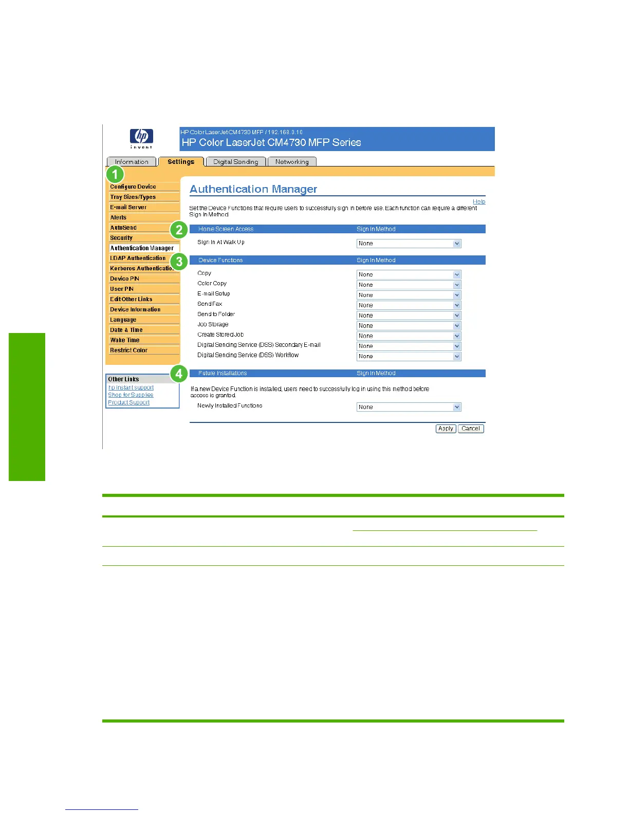 Use the Authentication Manager screen to set the Device Functions that require users to successfully