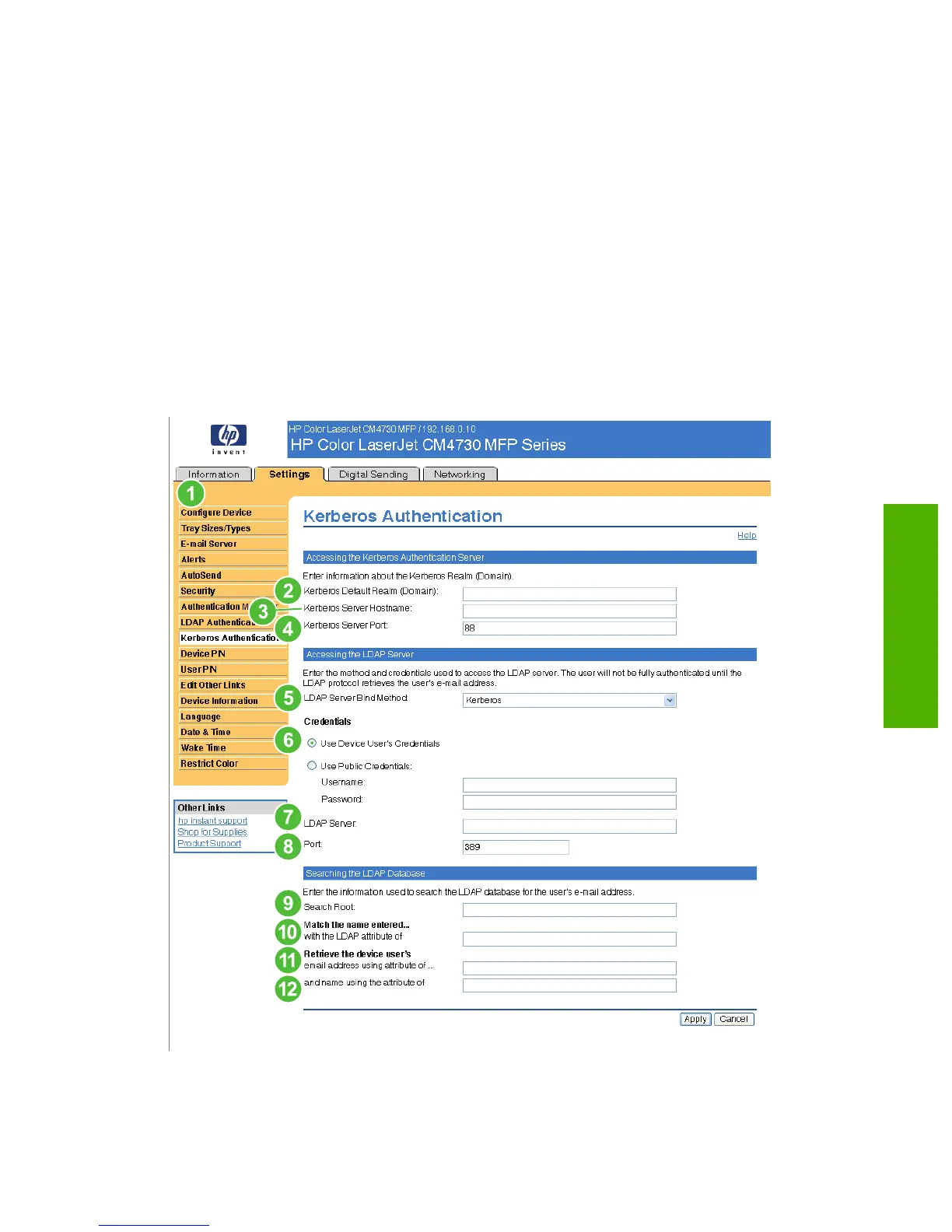Use the Kerberos Authentication page to configure the device (multi-function peripheral or digital sender)