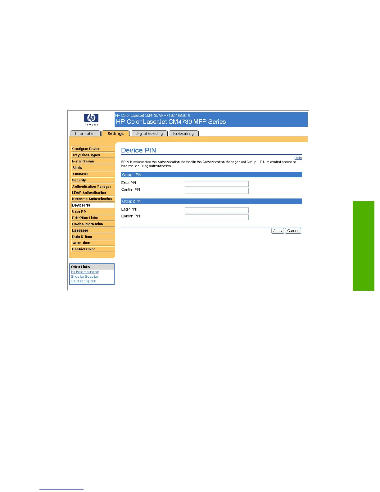 page, the user will be prompted for a PIN before they can access those Device Functions. If the PIN is