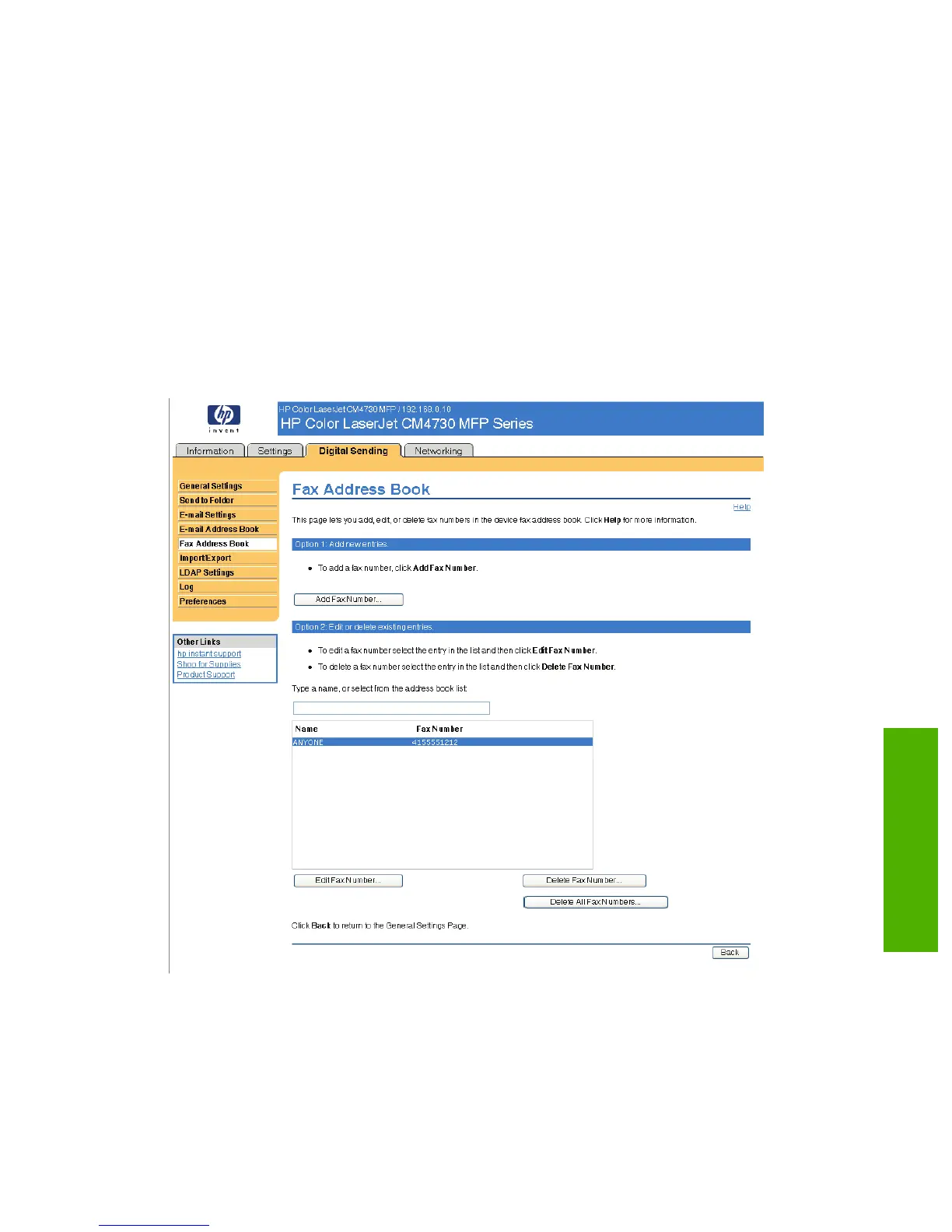 document from the front panel of the MFP device. The Fax Address Book page enables you to add fax