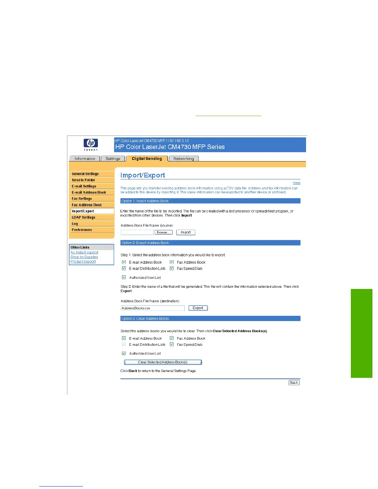 Use this page to import and export address book and user information to and from the device.