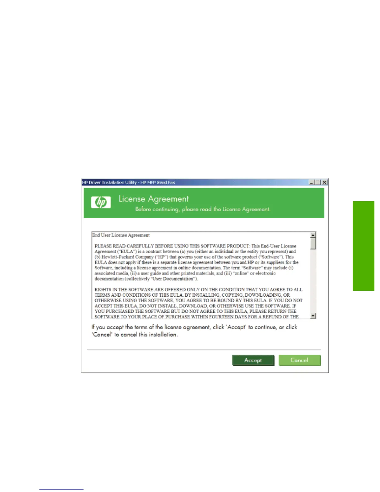 Figure 3-33 Send Fax Driver Installation — License Agreement screen