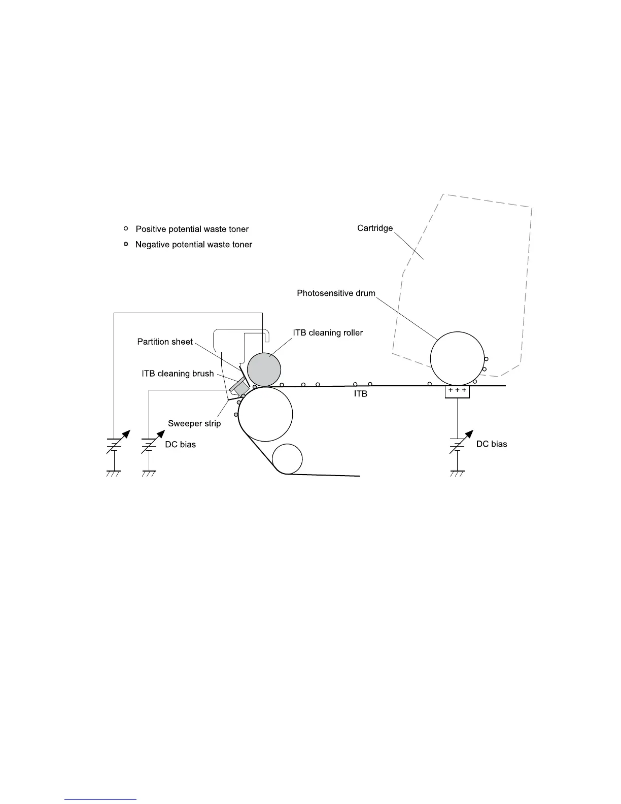 The ITB cleaning roller and the cleaning brush are applied with DC positive bias to charge the residual