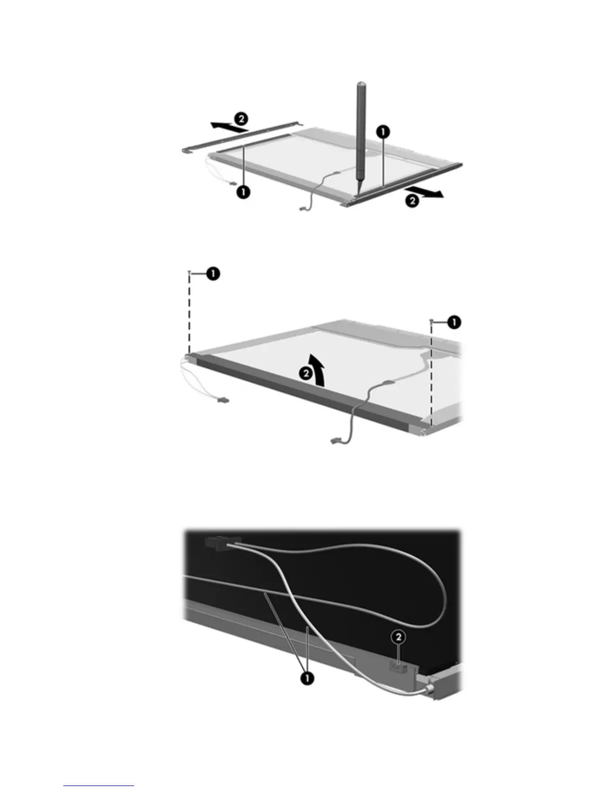 9. Use a sharp-edged tool to cut the tape 1 that secures the sides of the display panel to the display panel frame.