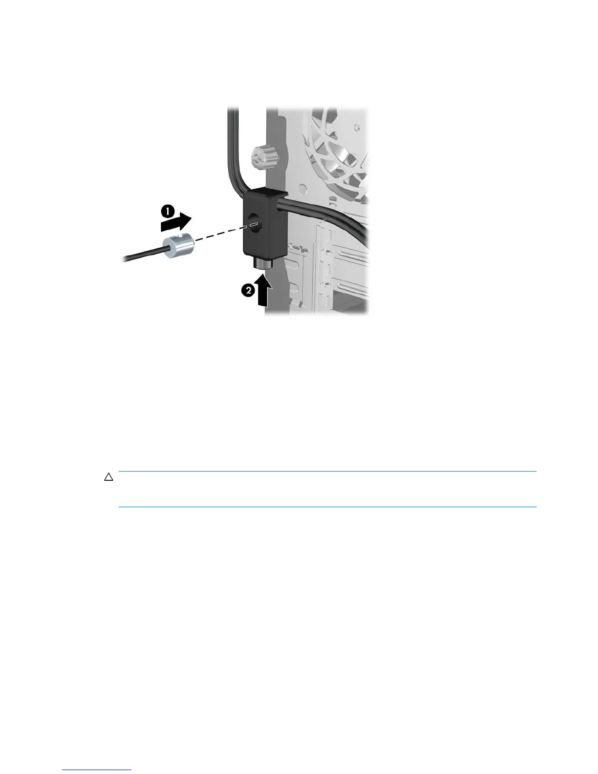 4. Insert the plug end of the security cable into the lock (1) and push the button in (2) to engage the