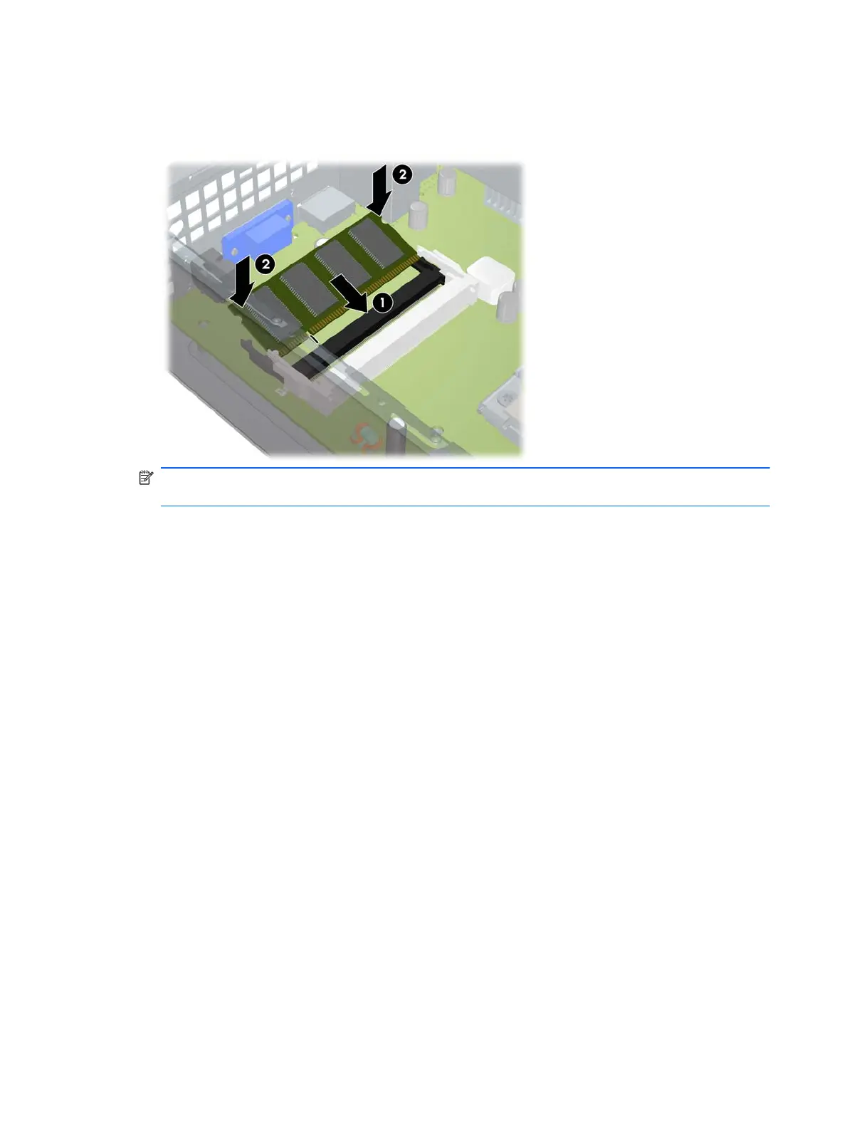 5. To install a SODIMM, slide the new SODIMM into the socket at approximately a 30° angle (1)
