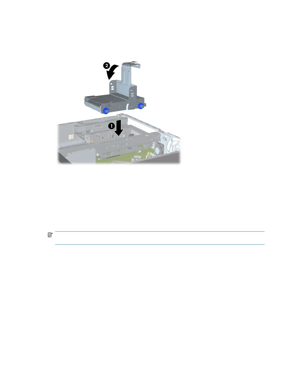 drive bay, drop the carrier straight down into the drive bay (1), and press the handle on the