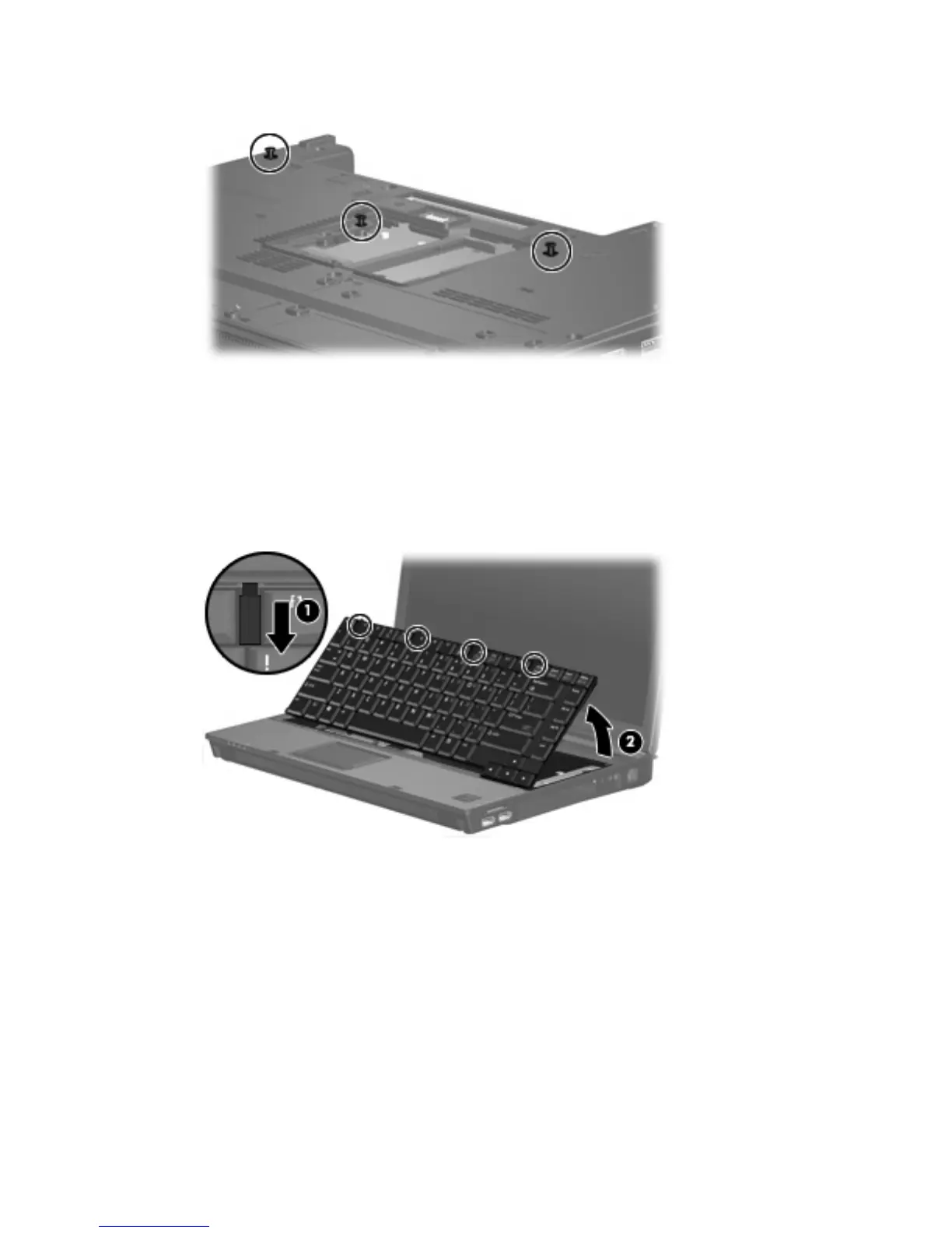 5. Slide the four keyboard retention tabs (1) toward you. The tabs are located between the esc and