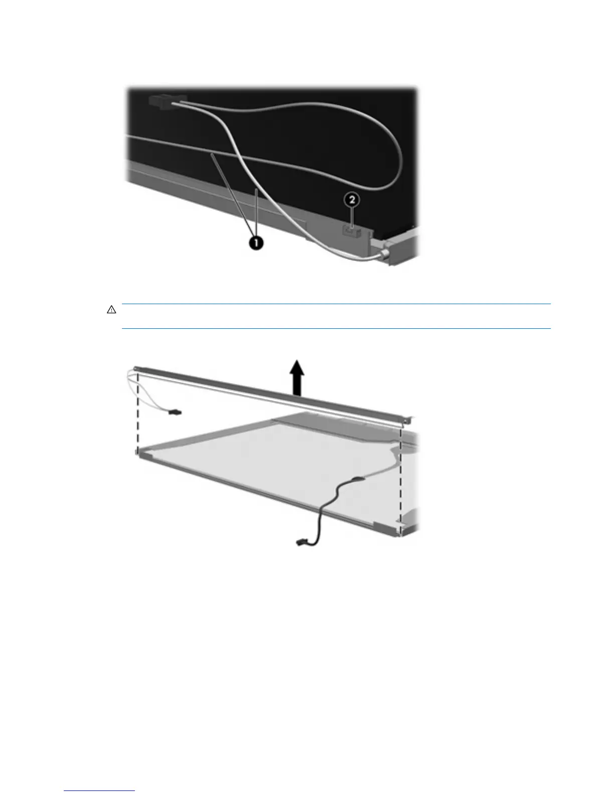 15. Remove the backlight cables (1) from the clip (2) in the display panel.