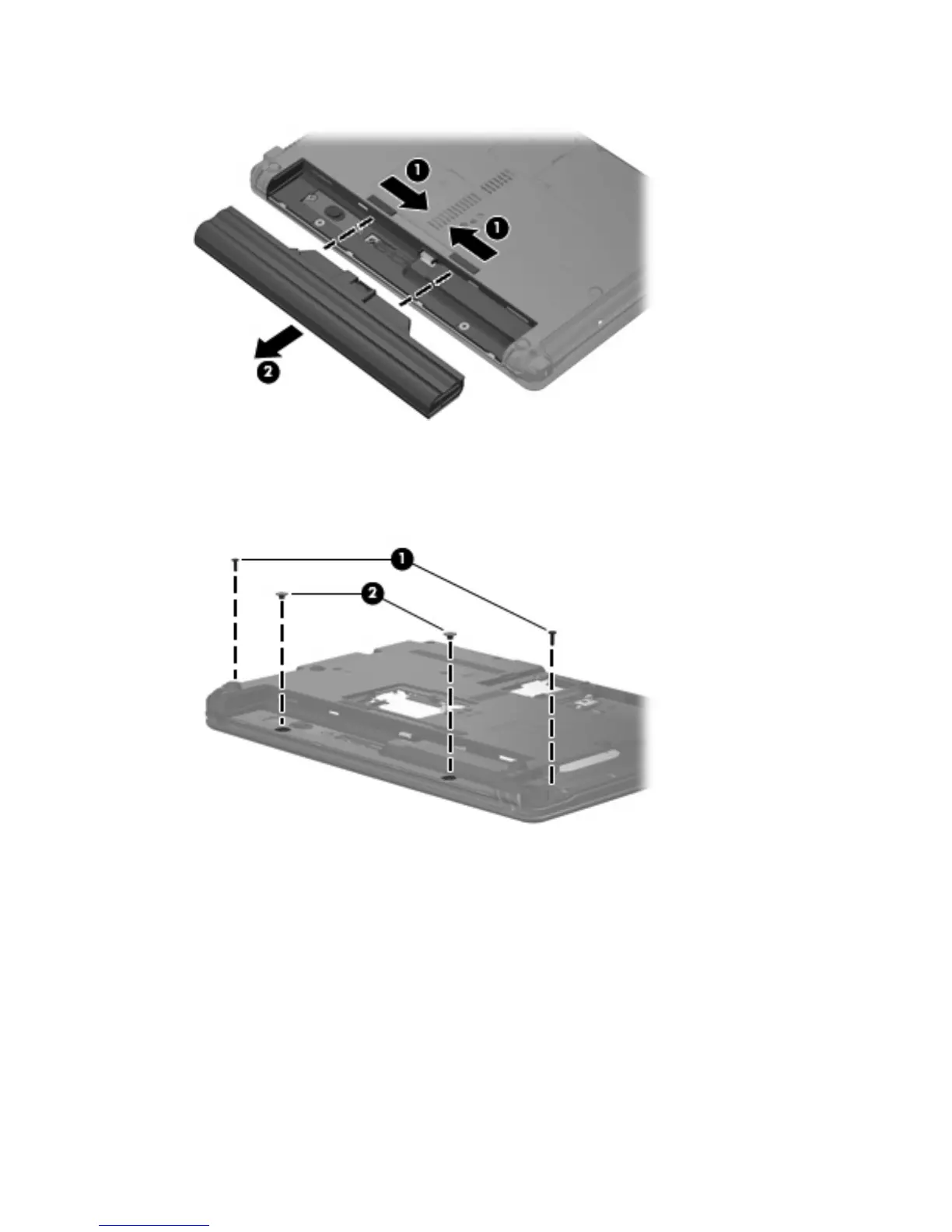6. Remove the battery (2) from the computer.