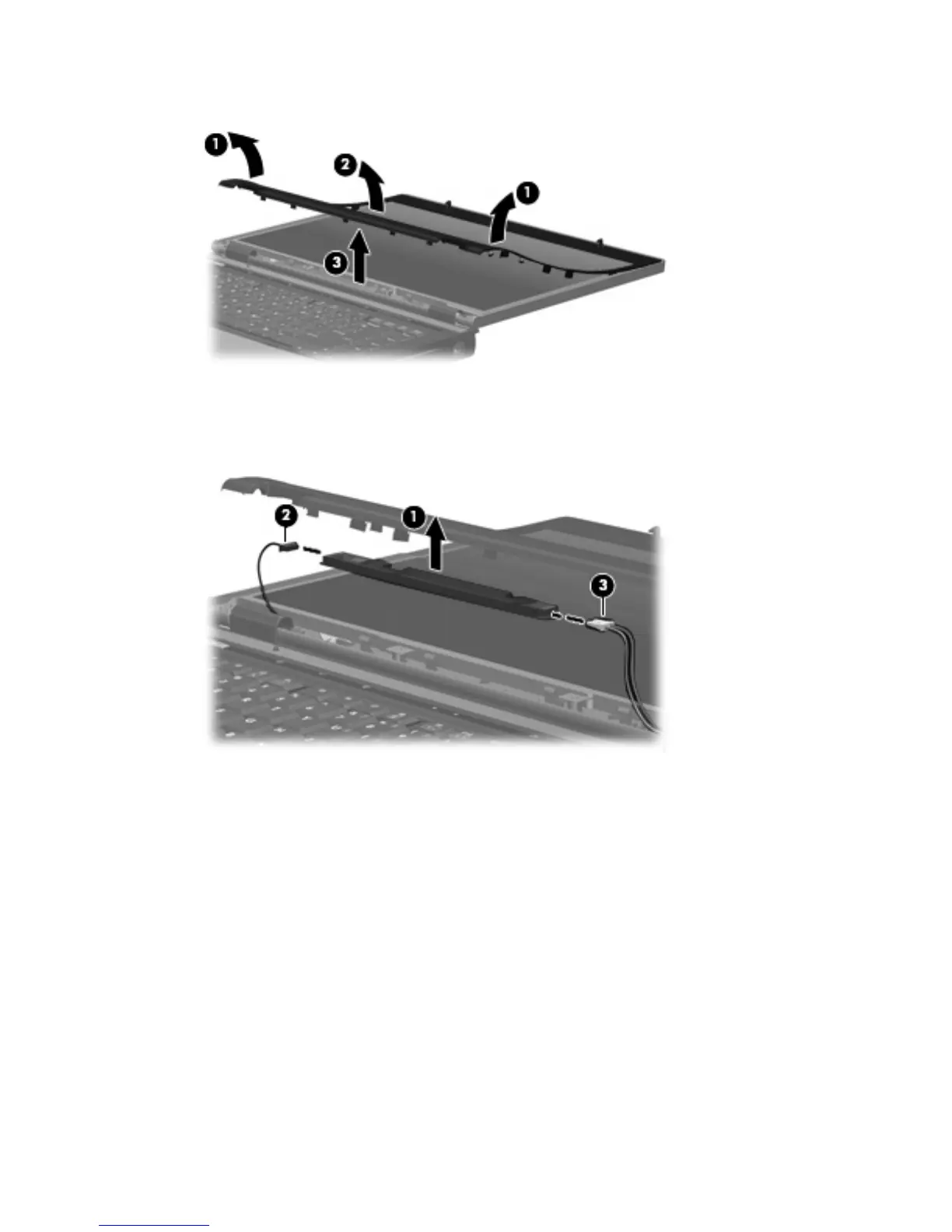 8. Disconnect the display panel cable (2) and the backlight cable (3) from the display inverter.