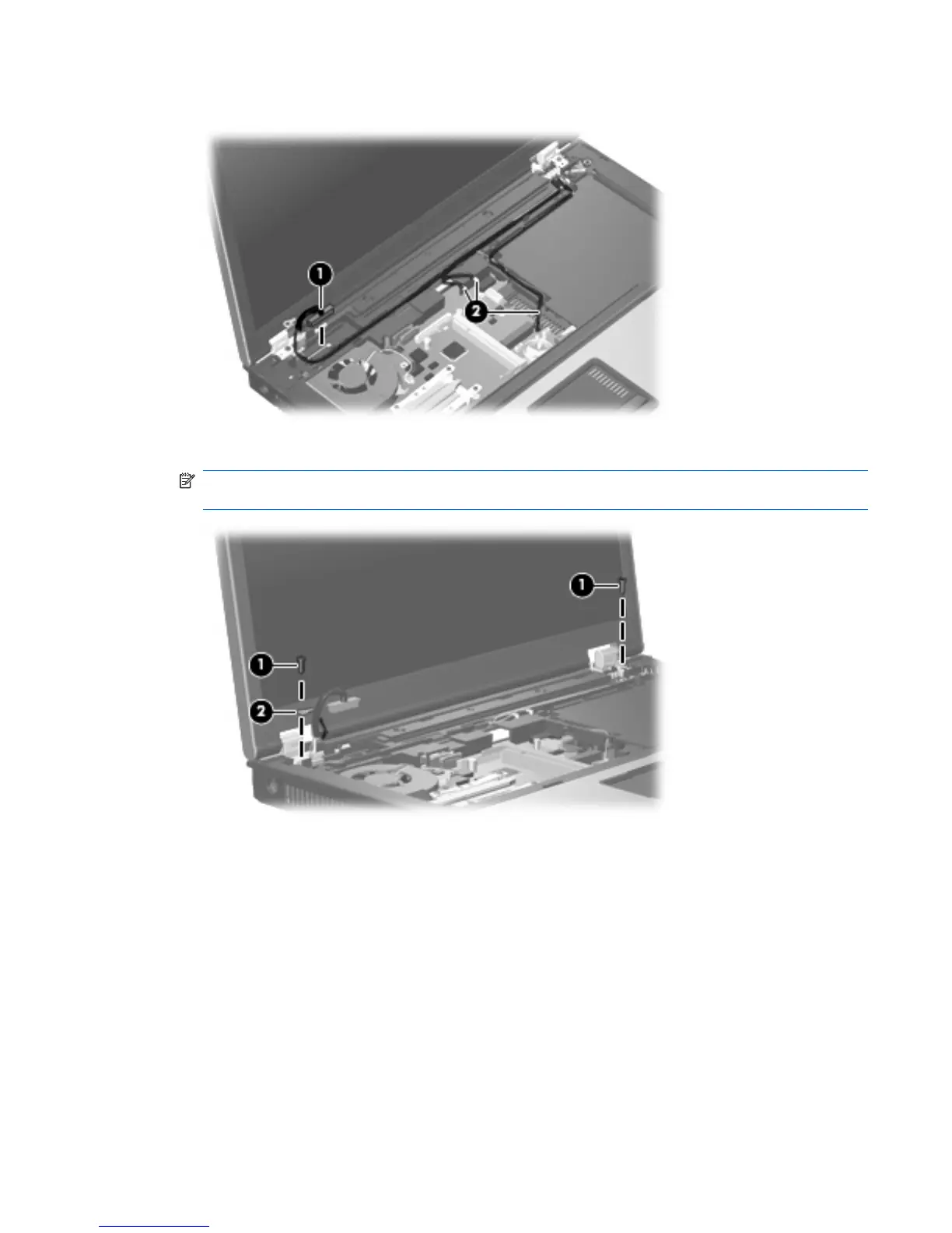 NOTE: The screw removed from the left hinge secures a ground loop (2) for the display panel
