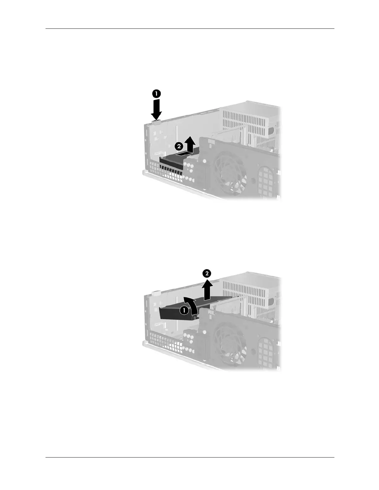 7. Press down on the lever to the left of the hard drive 1, slide the drive back until it stops, and