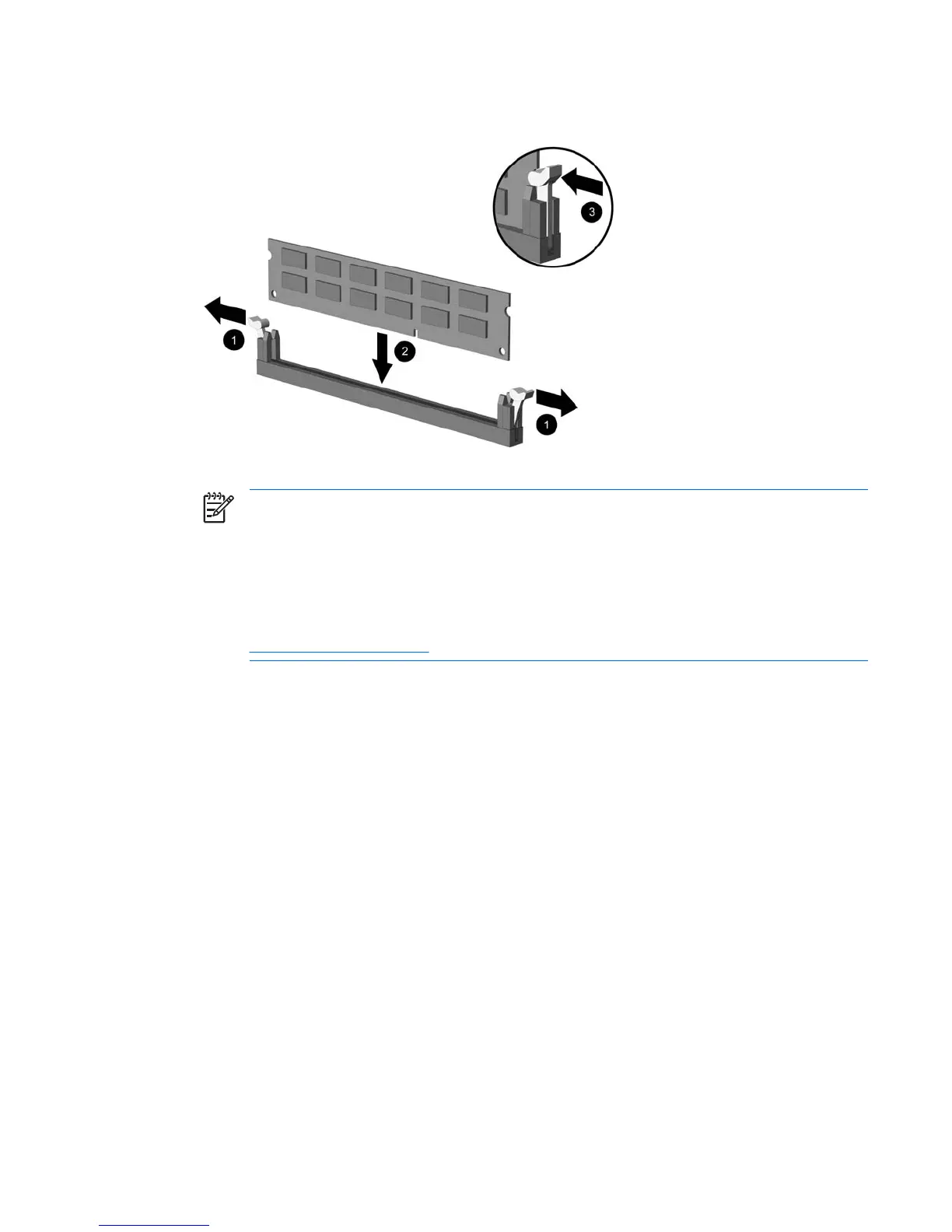 11. Open both latches of the memory module socket (1), and insert the memory module into the socket