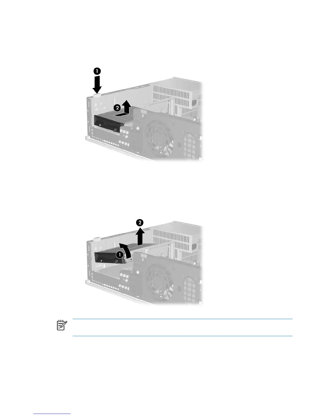 behind the metal frame, then pull the drive out of the drive bay (2).