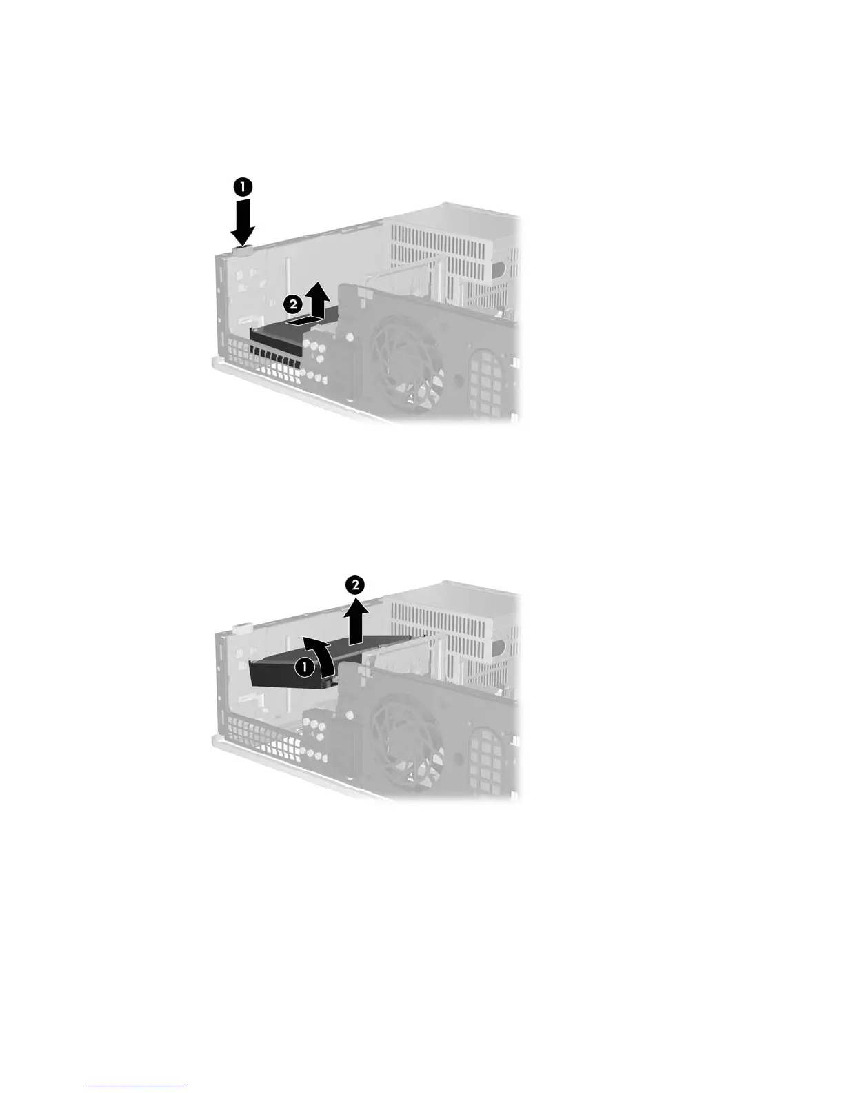caught behind the metal frame, then pull the drive out of the drive bay (2).