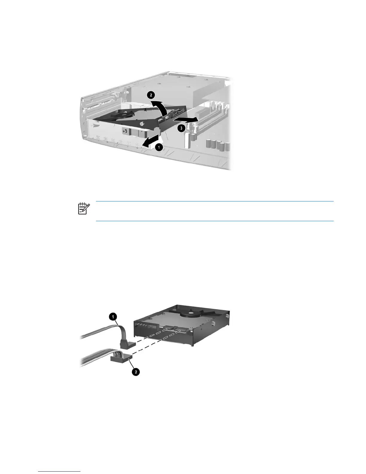 11. Disconnect the power cable (2) from the hard drive by pulling the connector out of the socket in