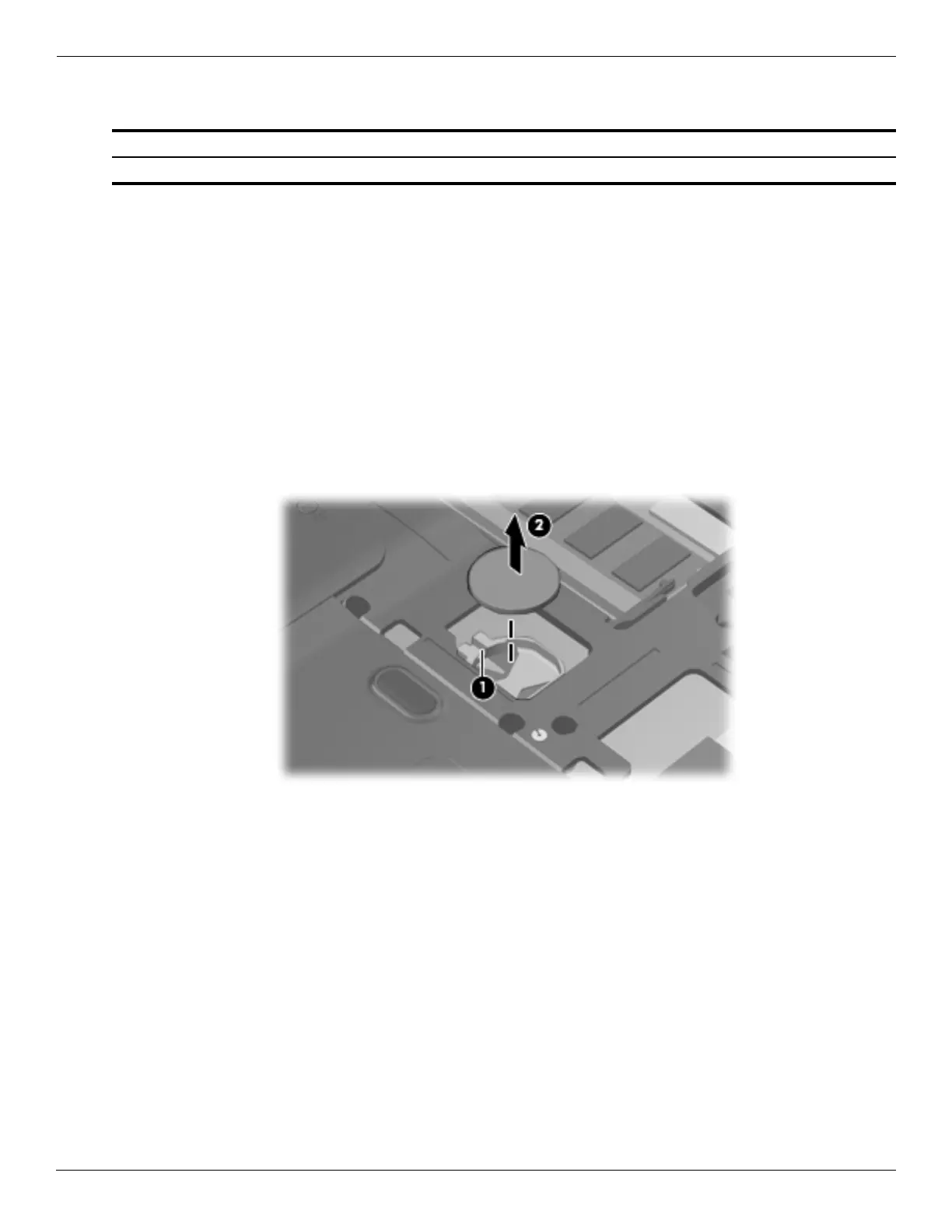 1. Use a sharp, non-conductive tool to release the clip 1 that secures the battery to the system board.