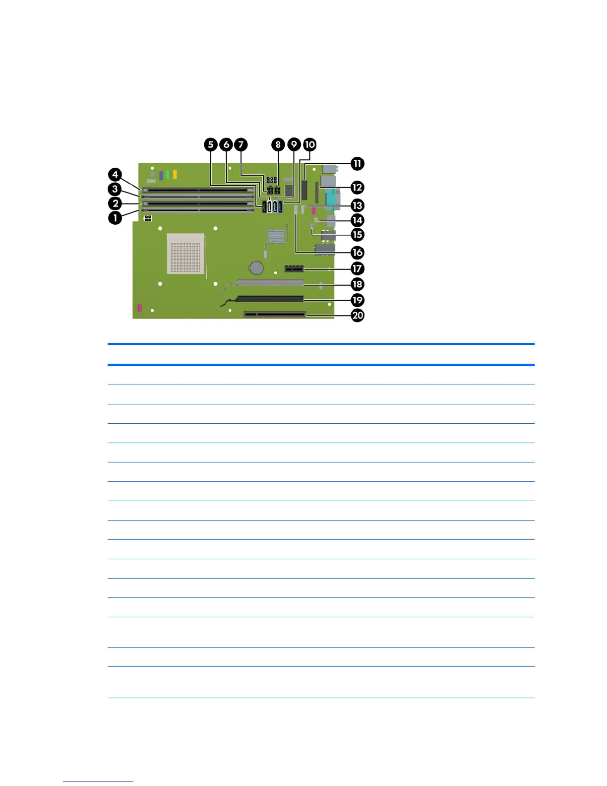 Refer to the following illustration and table to identify the system board connectors for your model.