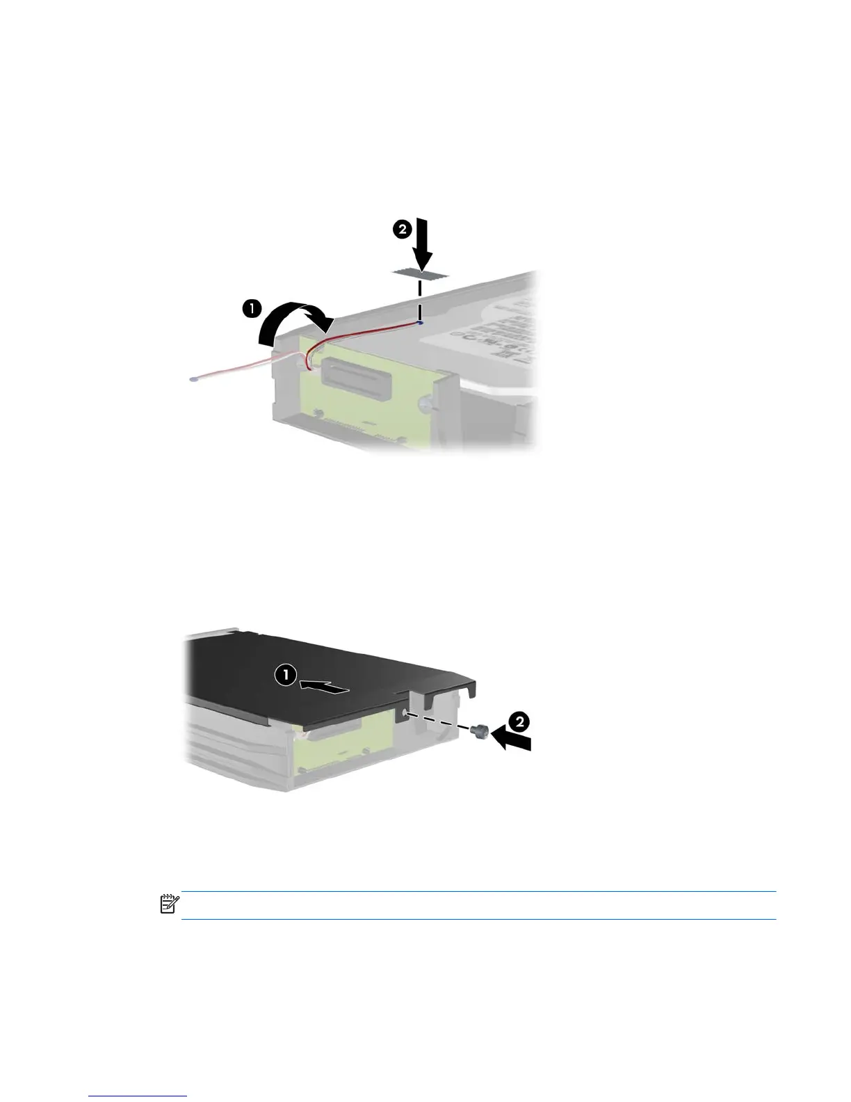 and attach the thermal sensor to the top of the hard drive with the adhesive strip (2).