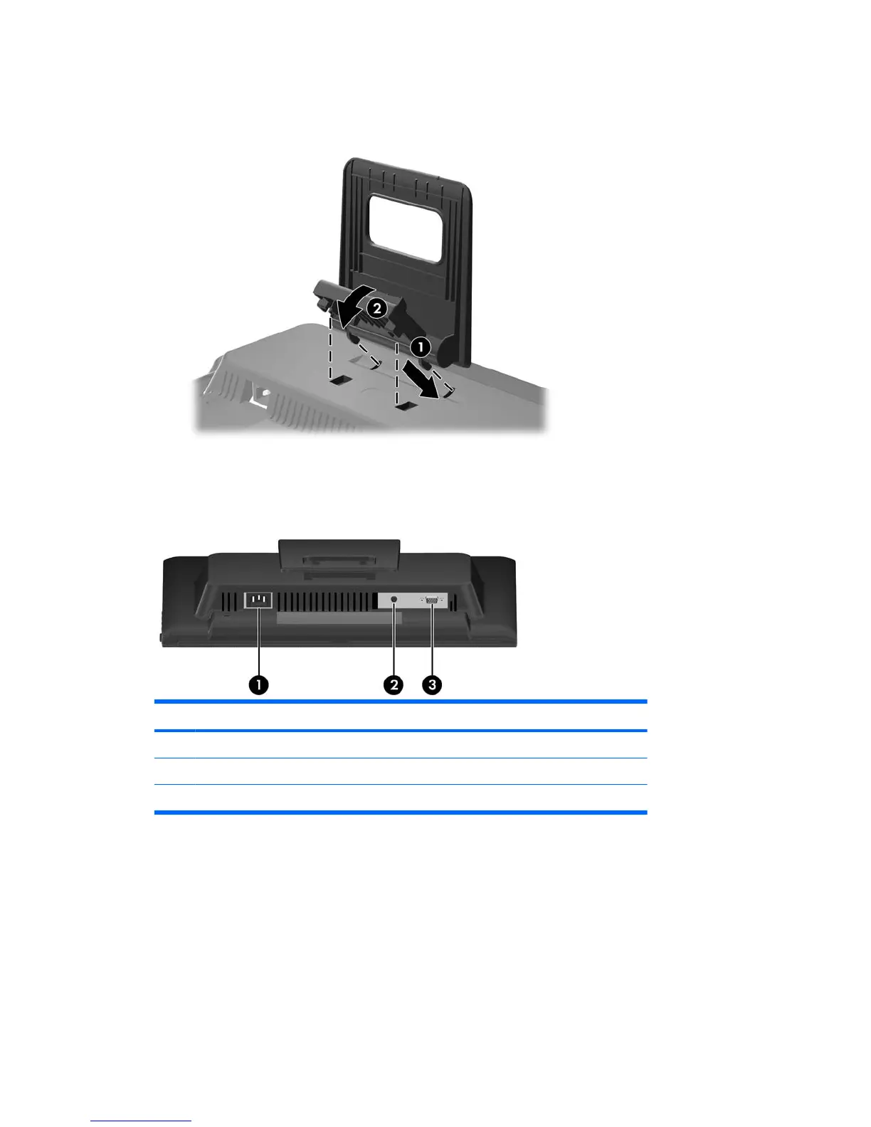 3. Slide the hooks at the top of the stand into the slots on the rear of the monitor panel (1) then snap